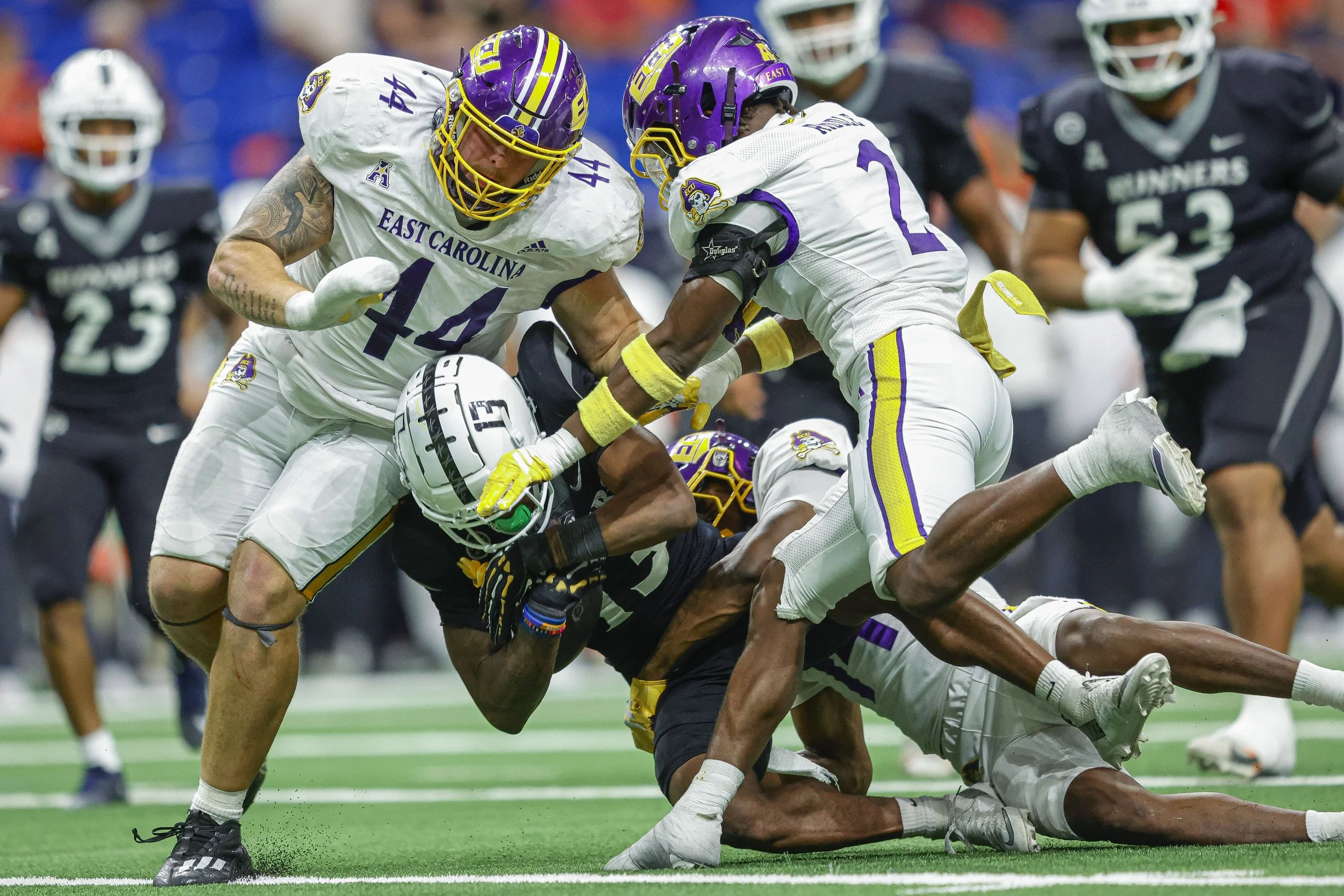 UTSA’s run game complements the passing attack perfectly. Will Henderson III consistently finds creases and turns small openings into big gains, forcing ECU’s defense to stay honest. The Roadrunners string together long drives and convert key third downs, flipping the field and keeping ECU’s offense off the turf. East Carolina does its best to respond, but UTSA’s balanced attack makes it hard for the Pirates to pin them down. Every time the visitors think they’ve slowed things, UTSA finds another gear. By the time the second quarter rolls around, UTSA has built a comfortable lead. Their offense keeps answering every ECU surge with points of their own.